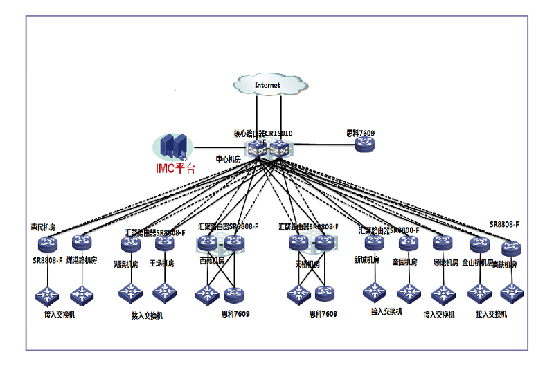 2015年10月徐州广电城域网采用了华三两台CR16K路由器堆叠(IRF)作为核心设备和出口路由器,十三台SR88路由器作为汇聚,该设备具备高性能路由转发能力、业务处理特性,如H-QOS流量工程、QINQ终结、BRAS板卡扩展等,可以为将来增值性业务的开展提供有力基础。满足宽带上网、互动、集团专线接入的业务发展,大幅度提高网络传输的安全性、可靠性、可管理性。